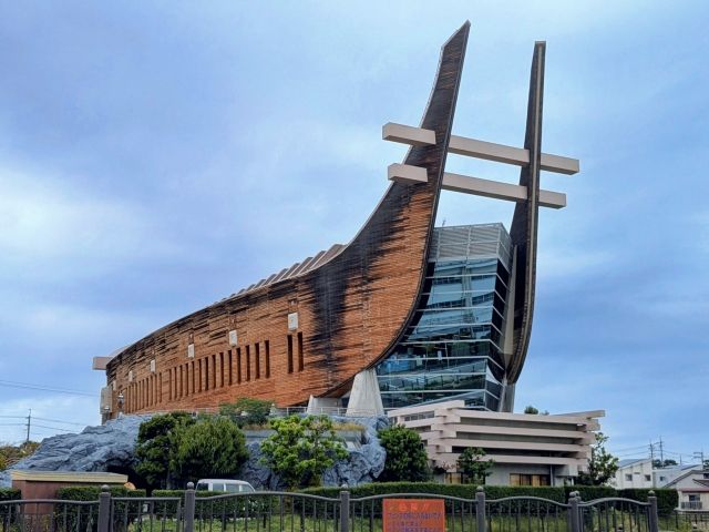 こちらはアイセルシュラホールという、地域のコミュニティ施設と博物館が融合したスポット。インパクトがありすぎる外観は、三ツ塚古墳から出土した巨石運搬ソリ「修羅(しゅら)」と、岡古墳から出土した「船形埴輪」をモチーフしてデザインしたものです。