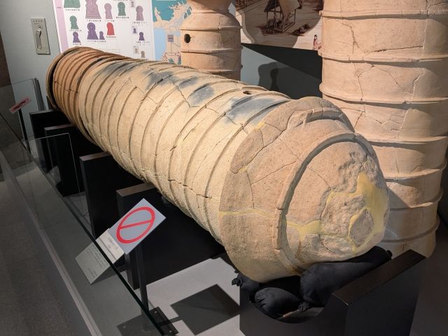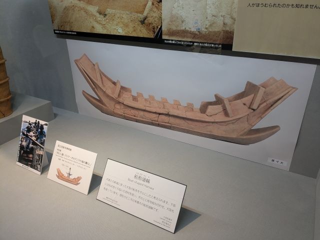 「盾形埴輪」や「衣蓋形埴輪」、そしてこの建物のモデルにもなった岡古墳から出土した「船形埴輪」もあるのですが、国立民族学博物館の特別展「舟と人類 アジア・オセアニアの海の暮らし」に貸し出し中でした。