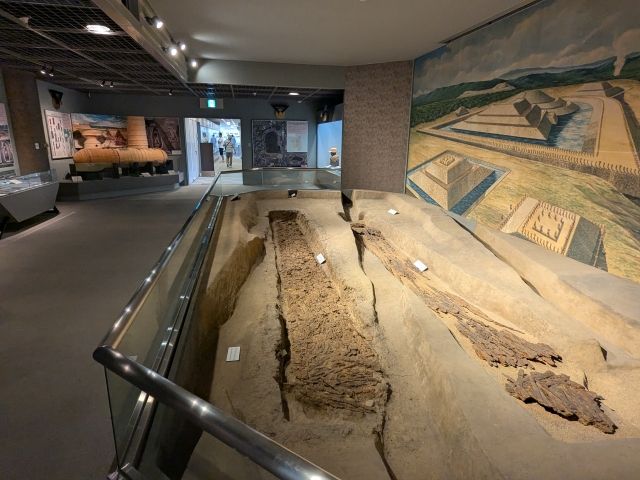こちらの大きな展示物は「西墓山古墳の主体部」。墳丘の中央に掘られた穴には、鉄製の武器や農耕具が入った箱が納められていたそうです。