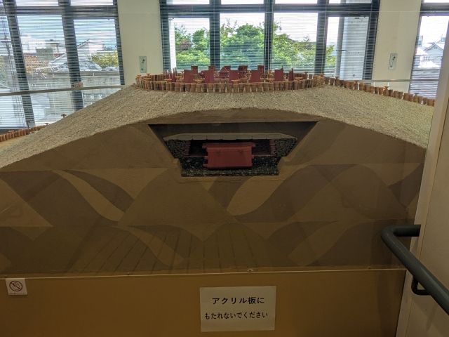 このジオラマ、トイレの側の通路から見ると断面図を見ることができます。そこに見えるのは納められた石槨。ここに被葬者で眠っていたのですね。