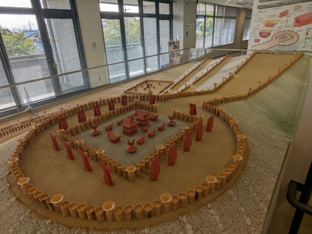 このジオラマは、カプセルトイでおなじみの海洋堂が制作したもの。墳丘に敷かれた葺石や、ずらりと並ぶ円筒埴輪など細部まで丁寧に仕上げられています。壁に描かれたポップな解説イラストもわかりやすくて良いです。