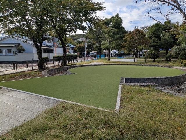 ひととおり展示を見終えたので外に出ると、そこには人口芝の広場が。このカタチ、前方後円墳ですね!