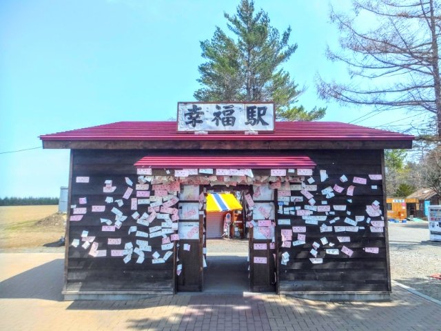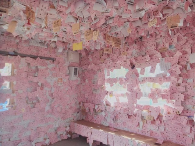 愛国駅同様に駅舎が残されてます。入るとそこは・・・一面のピンクワールド!『幸福ゆき切符』が隙間なく貼られているのです!貼りきれず、山積みされた幸福も。
