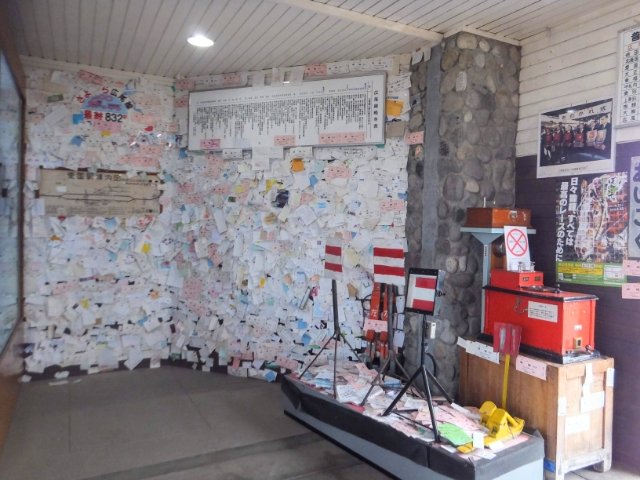 駅舎の中は鉄道記念館となっています。壁一面に貼られているのは「幸福ゆき切符」。そこまではわかるのですが、写真、プリクラ、名刺なども混ざってます。いったいどんな意図があって貼っているのかな?