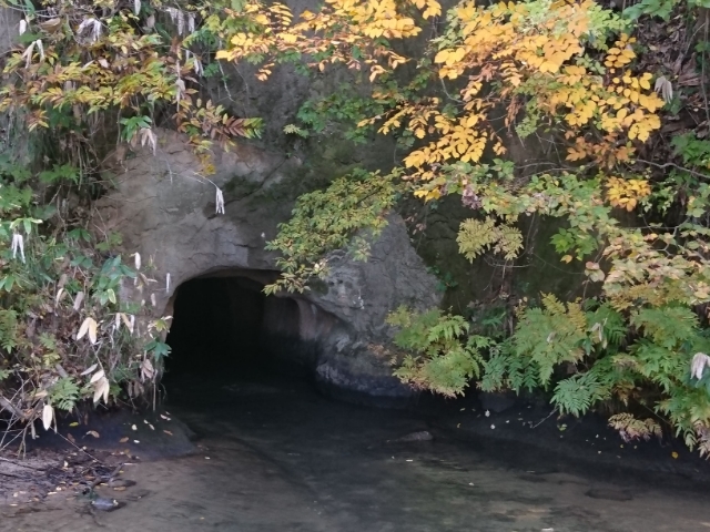 静かな池の奥には、戸ノ口堰洞穴と呼ばれる穴が見えます。猪苗代湖北西岸の戸ノ口から会津まで水をひく人口の洞穴で、かつて戸ノ口原の戦いで敗走した白虎隊士たちはこの穴を通ってここまで逃げてきたといいます。