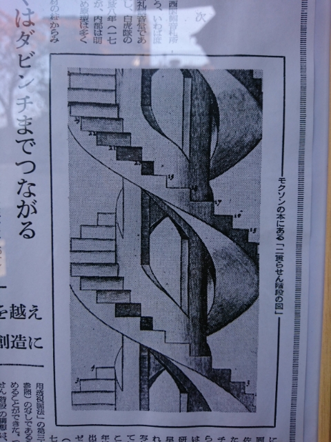 掲示されていた朝日新聞の記事によりますと、レオナルド・ダ・ヴィンチの設計と伝わるシャンボール城の二重らせん階段が蘭書に記載されて日本に伝わり、影響を与えたとの説もあるようです