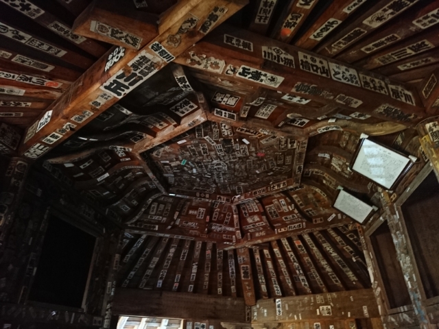 ぐるぐると上っていくと、最上部に到着。天井にはお札がびっしり!!まるで何かを封印しているかのようですが、こちらはおそらく千社札。参拝の証として貼られたものであり、多くの人に信仰されてきたことを物語っています。