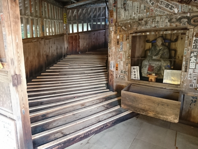 料金を支払い、堂内へ。このさざえ堂、正式名称は「円通三匝堂(えんつうさんそうどう)」。入口には、このお堂を建立した郁堂(いくどう)禅師の像が安置されていました。