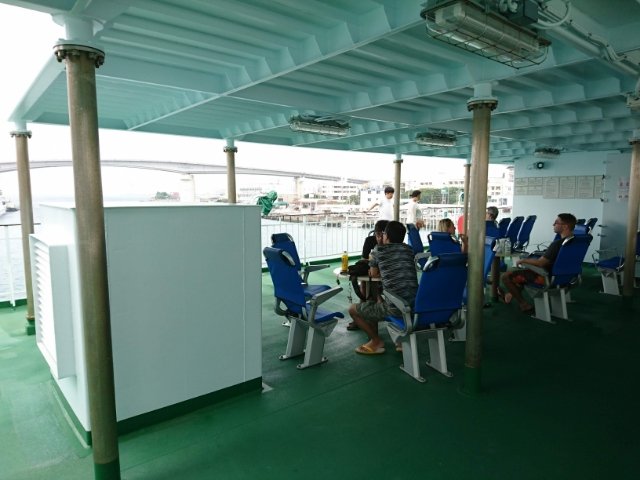 高速船と違って、自由に行動できるのがフェリー最大の魅力。海を眺めたり、デッキで海風を感じたり、荷物を広げて整理したりしていると、90分はあっという間。