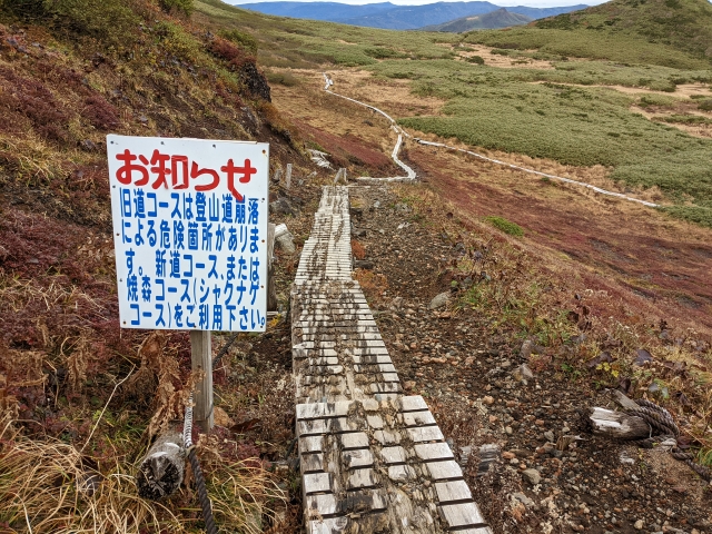 阿弥陀池から旧道コースの入り口は、「男女岳」と「阿弥陀池避難小屋」の間あたりにあります。すぐに見えてくるのは「旧道コースは登山道崩落による危険箇所があります。新道コース、または焼森コースをご利用下さい。」の案内板。ううむ、ちょっと引っ掛かりますが、先を見渡しても普通に歩けそうな予感。