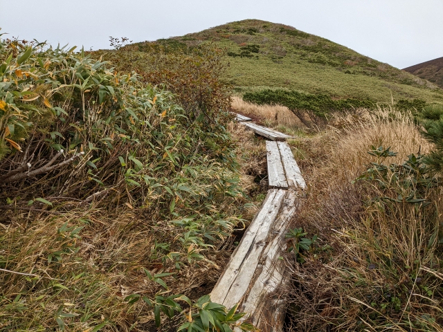 しばらくは木道が続いています。阿弥陀池周辺の木道に比べると少し荒れていますが、問題なく歩けるレベルです。