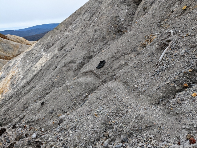 先ほどのロープを上った先まで戻ると、近くに別のロープを発見しました!一山越えるとすぐに新道コースとの合流地点が見えてきます。どうやら、鉱山からの脱出に成功したようです。