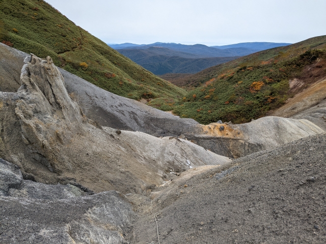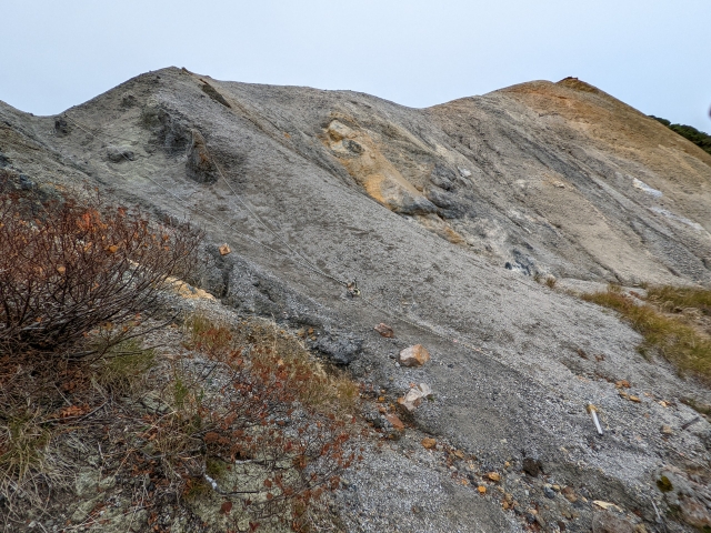 まるで爆裂火口のようにも見えますが、ここは「旧日窒硫黄鉱山跡」。○○年から操業を開始し、○○年に閉山、全盛期は○○人の人が働いており・・・・といったような情報を書きたいところですが、検索しても登山記録にちらっと名前が出てくる程度。鉱山の詳しい情報が全然みつかりません。とりあえず、八合目という山頂付近まで道路が伸びているのも、この鉱山があって人が出入りしていたためのようです。