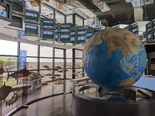 エントランスロビーで来館者を出迎えるのは直径1.8mの海底地球儀。通常の地球儀とは違い、海底の地形も記されています。