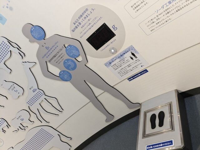 体重計に乗ると、体の中の塩の量を測ってくれます。大人だと体重の0.3〜0.4%くらいとのこと。60kgで180〜240gくらいです。