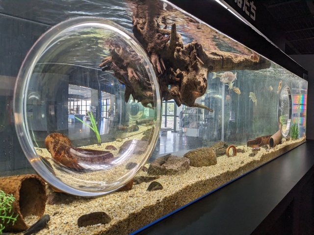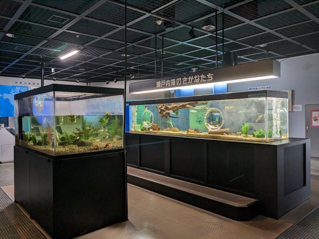 2つの水槽が置かれており、生きているサカナにも出会えます。水族館と呼ぶには控えめですが、やっぱり生きている生物に会えるのは楽しいポイント。