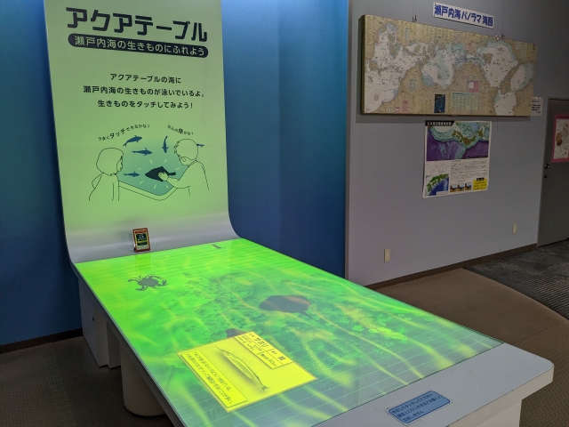 あざやかに輝くアクアテーブル。泳いでいる生き物のシルエットにふれると解説がはじまる、体感型の展示です。