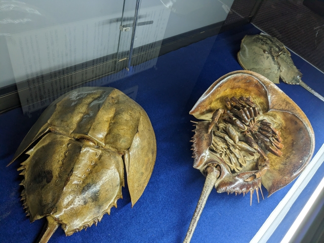 こちらは瀬戸内海にも生息しているカブトガニの剥製。表側はツヤツヤしてきれいですが、裏側は虫っぽい要素が強めです。