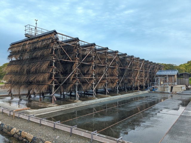 こちらは「流下式塩田」。粘土を張った流下盤に海水を流して太陽熱で水分を蒸発、さらに竹の小枝でつくった枝条架に海水を流すことで、風力により水分を蒸発させていくという製塩方法を行う塩田。入浜式塩田よりも生産能力が高く労力も少ない、製塩における産業革命とも呼べる塩田であったそう。