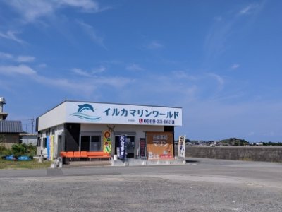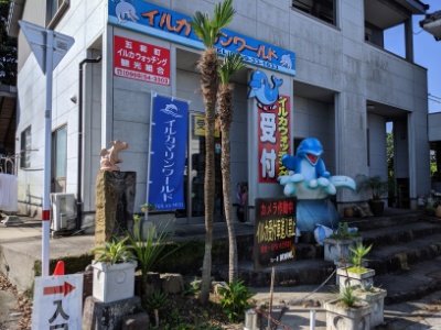 天草下島・本渡の市街地から車で約25分、イルカマリンワールドの受付事務所へやってきました。カラフルな看板とヤシの木でトロピカルな雰囲気です。