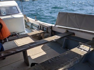 座席は板張りですが、イルカポイントに着くとイルカが見える位置を求めて船内あちこち動き回るので、あまり座っていないため気になりません。
