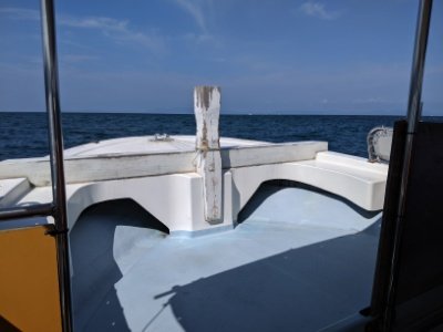 波に揺られながら沖へと進みます。今日はそこそこ風が吹いていたため、船はかなり揺れる。酔い止め飲んでなかったら、即効でリバースしていたかもしれません。