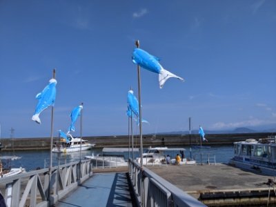 出港10分前くらいになると、船のスタッフさんが呼びに来てくれました。鯉のぼりならぬ「イルカのぼり」が並ぶ桟橋を渡り、船に乗り込みます。