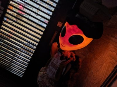 大通りを少し入ったところ、入口に立つ黄色いエイリアンが目印。このエイリアン、10月は黒いマントでハロウィン仕様。季節によって服装が変わるそうです。