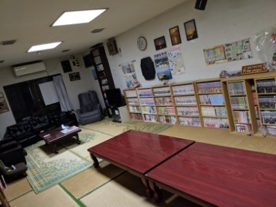 広々とした共有スペース。たくさんのマンガやゆったりソファ、マッサージチェアやダーツもあります。