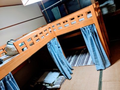 こちらが今回利用したドミトリー。和室に2段ベッドが2基設置されたシンプルのお部屋。下段はカーテン付きですが上段にはありません。私は上だったのですが、他に上段に人がいなかったので良かった。室内には物干し竿とハンガーもあります。