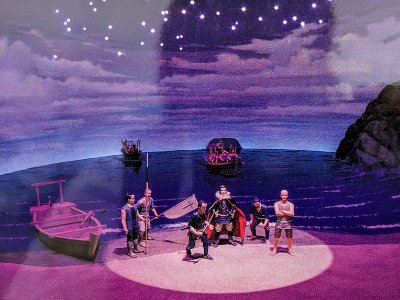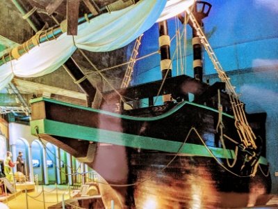 タイムトンネルをくぐると、そこは南蛮船こと小型ガレオン船のデッキ。フランシスコ・ザビエルや織田信長が現れ、約450年前のキリスト教の伝来の時代へとタイムスリップ。まるでテーマパークのような演出で、一気に引き込まれます。