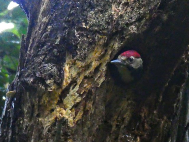 途中、三脚を構えたカメラマンたちが集まるポイントがあります。何を撮っているのか聞いてみると、オーストンオオアカゲラの巣があるそう!