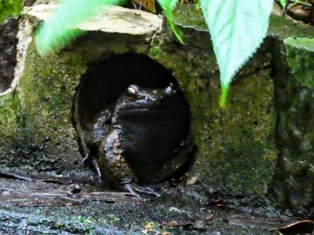 木の穴にはまったアマミイシカワガエルも教えてもらいました。写真では分かりにくいですが、金色に輝くとても美しいカエルです。