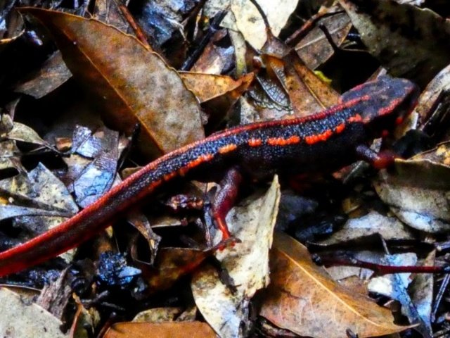 落ち葉の上を歩いているのはアマミシリケンイモリ。黒&赤というアカハライモリと同じカラーリングですが、背中や手先も赤いなのが特徴的です。