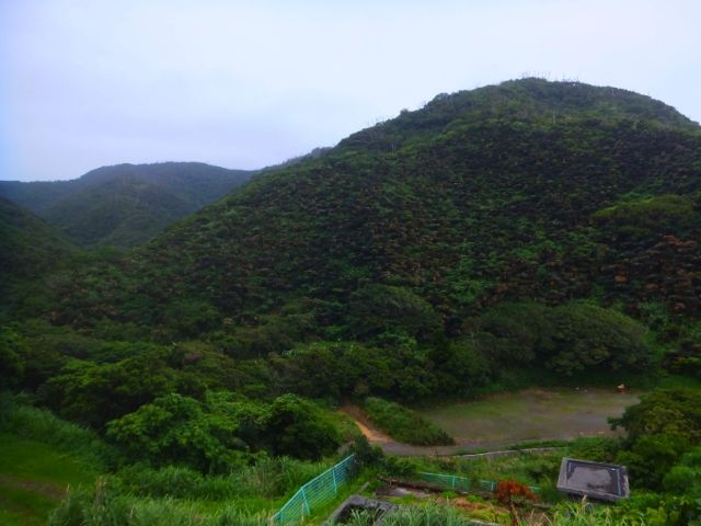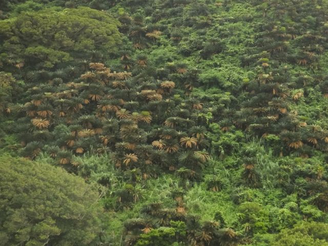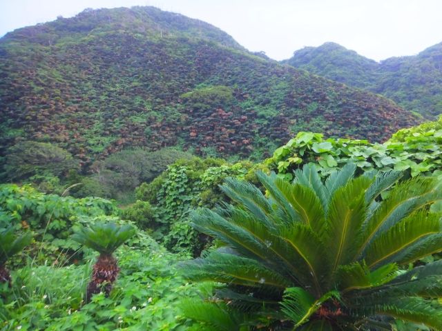 空港へ行く前に、自然観察の森すぐ近くのソテツの群生地へも寄り道。ただの山に見えるでしょ?これ全部ソテツなんですよ。