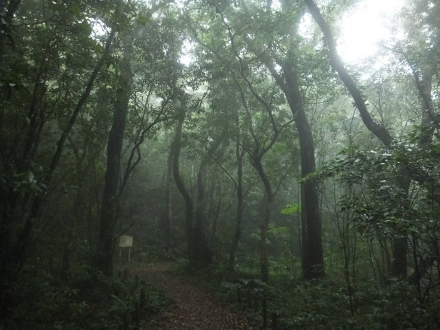 道路から一歩足を踏み入れると、そこは深い森林が広がります。霧がかった森は、思っていた以上に幻想的。鳥の鳴き声があちこちから響き渡ります。