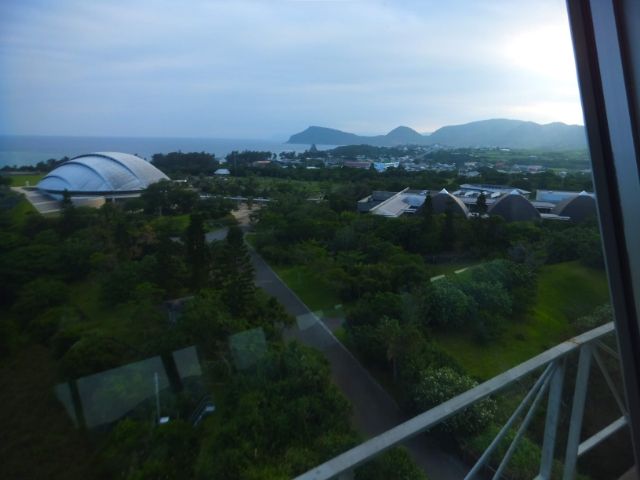 ガラス窓の外には広がる奄美大島の海。白いドームは先ほどまでいた奄美の郷です。