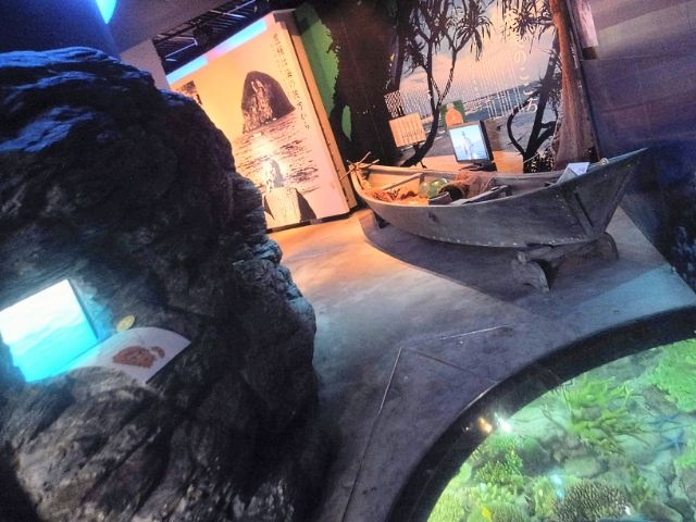 入館するとすぐに広がる海の世界。「アイノコ」と呼ばれる木の舟が横たわっています。