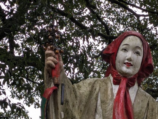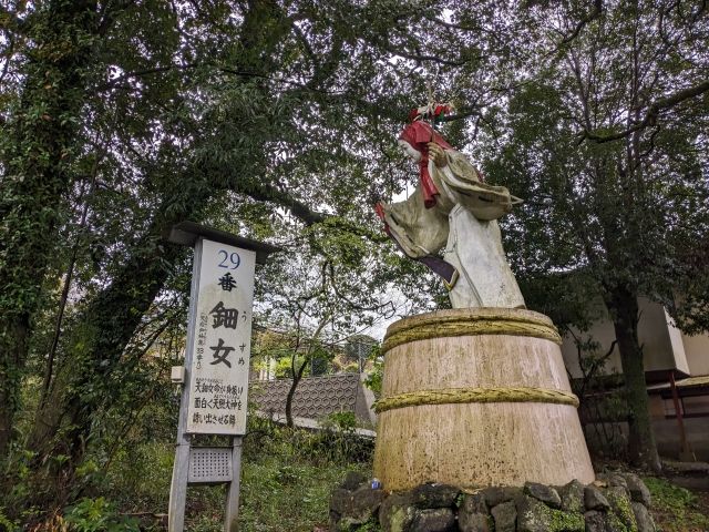 石段のそばにたたずむのは天細女命(アメノウズメノミコト)。天照大神が岩戸に隠れた際、舞を踊ったことで知られる芸能の神様です。