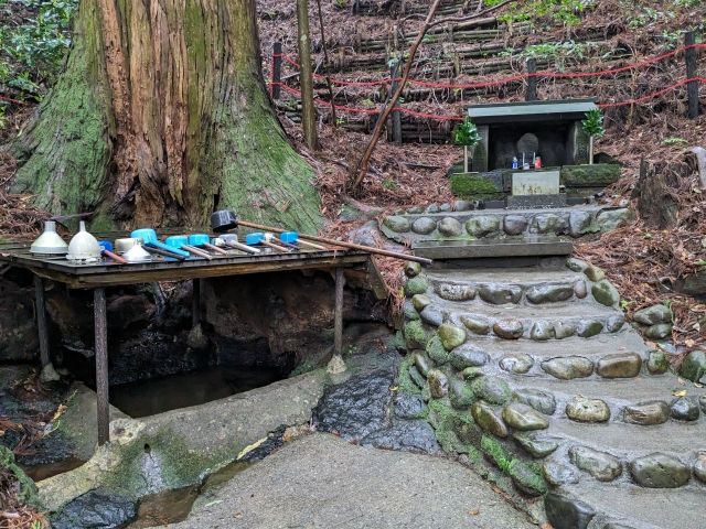 本殿の裏手へまわると通路があります。そこにあるのが御神水。杉の御神木の根元から水が湧きだしています。