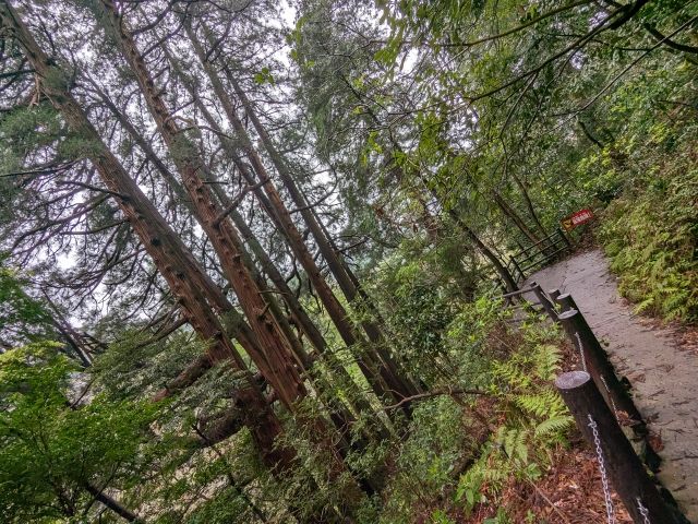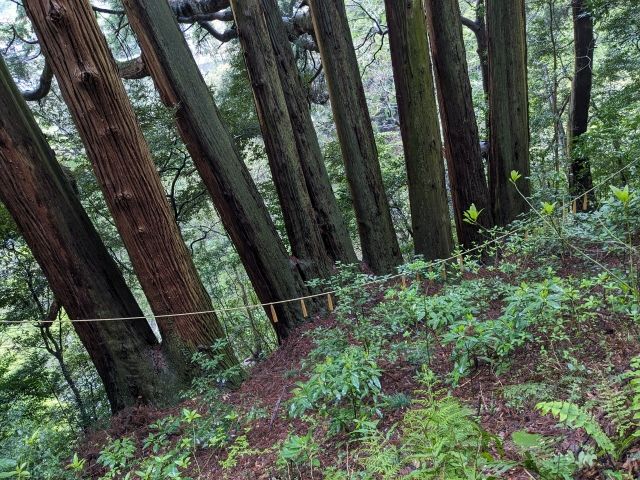 そして、御神水からさらに先へ進むと見えてくるのが七本杉。横一列にならんだスギは、なんだかとっても頼もしい出で立ち。