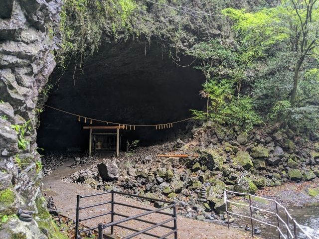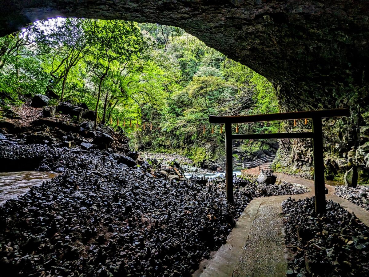西本宮の社殿から歩くこと5分。ぽっかり空いた大きな洞窟が見えてきました。ここが神話に登場する天安河原です。