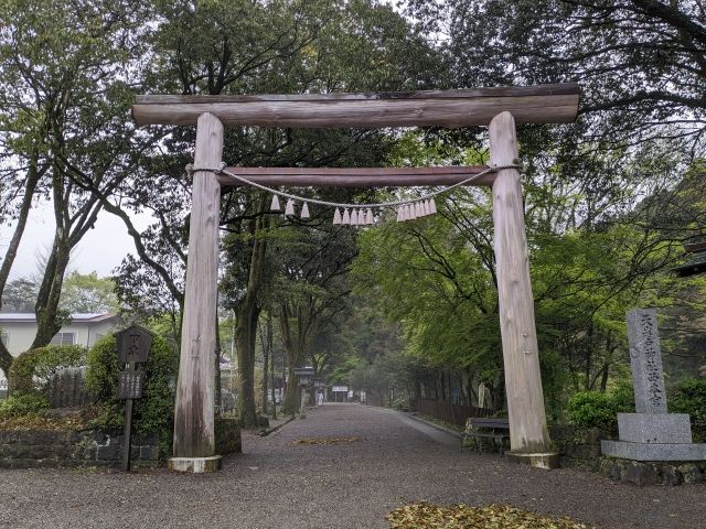 参道の入口にそびえ立つ木の鳥居。早朝のためうっすらと朝もやがたち神秘的な出で立ちです。