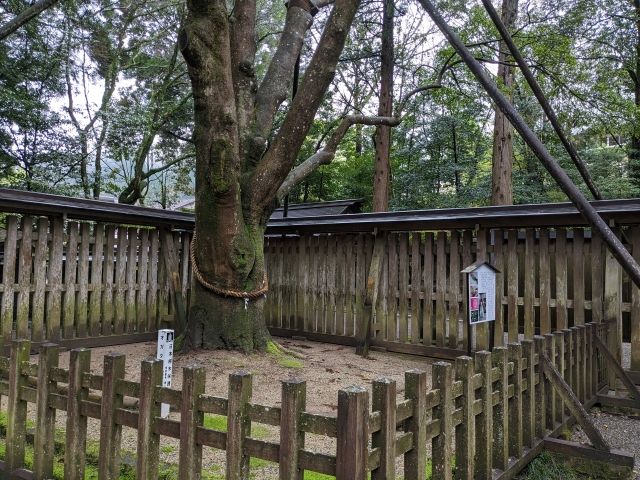 拝殿のそばに立つオガタマノキ。天細女命が岩戸から天照大神を誘い出すための舞を舞った際に手に持っていたとされる木。天岩戸神楽で使用される神楽鈴も、このオガタマノキの実がモチーフであるそう。