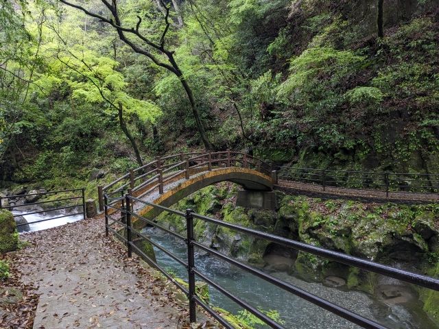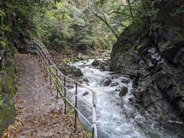 すぐに岩戸川の渓谷沿いの道に。水の流れる音と木々のさざめきが爽やか。