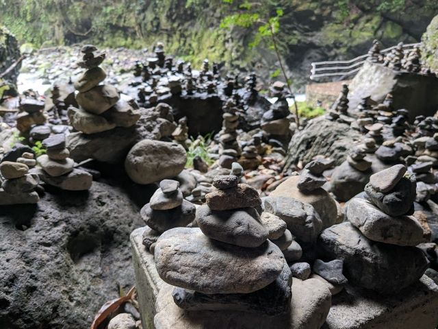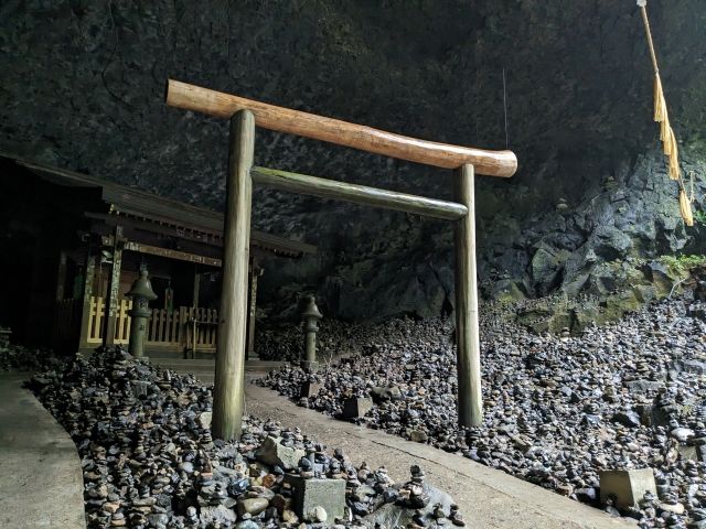 洞窟周辺では、積み上げられた石がたくさん。「願いを込めて小石を積むと願いが叶う」という習慣があるそうですが、これは神社に伝わるものではなく、参拝客の間で自発的に生まれたものであるらしい。