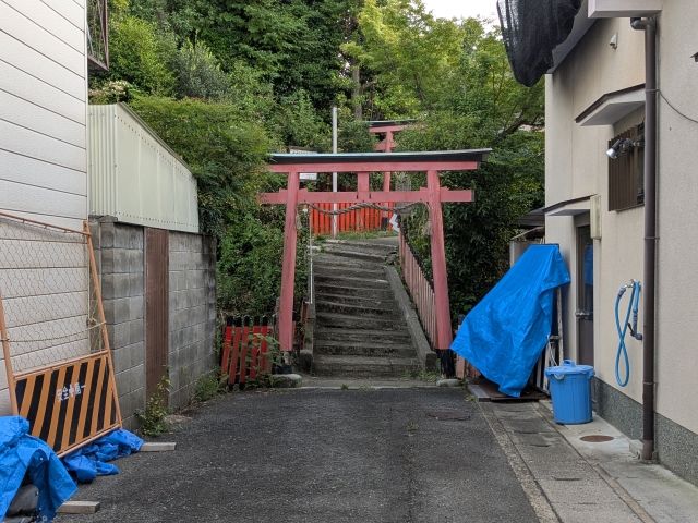こちらもやっぱり住宅街の中にあります。マップに従い進んでいくと、赤い鳥居が見えてきました。わかりにくいですが、どうやらここが古墳の入り口のようです!