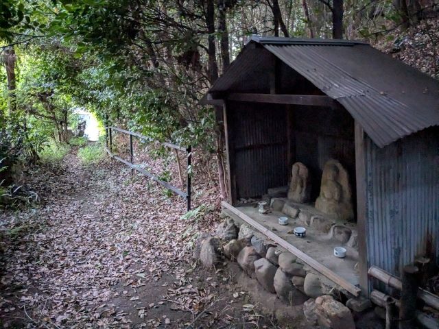 木々が生い茂る道をさらに進んでいくと、3つ並んだ石仏の姿も。