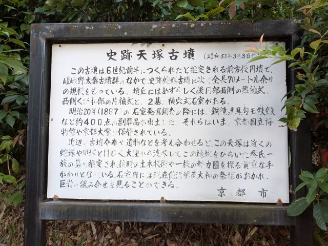 現地の案内板によると、明治20年(1887年)に鉄刀や須恵器、馬具など400点の副葬品が出土しています。被葬者は、かつてこの辺りを納めていた秦氏一族の首長であると考えられています。