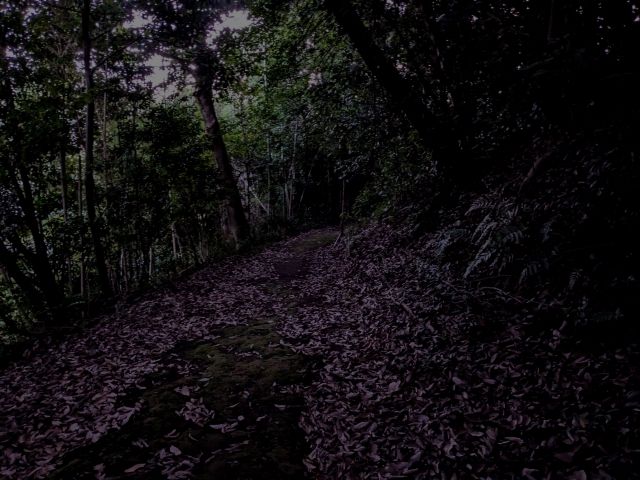 今回はまだ明るい日没1時間前に訪問したのですが、墳丘は背の高い樹木が生い茂っており、薄暗い空間。写真はGoogle Pixelのおかげで明るくなっていますが、実際は暗くて石碑や石仏はよく見えませんでした。あえて暗くすると、これくらいのイメージです。